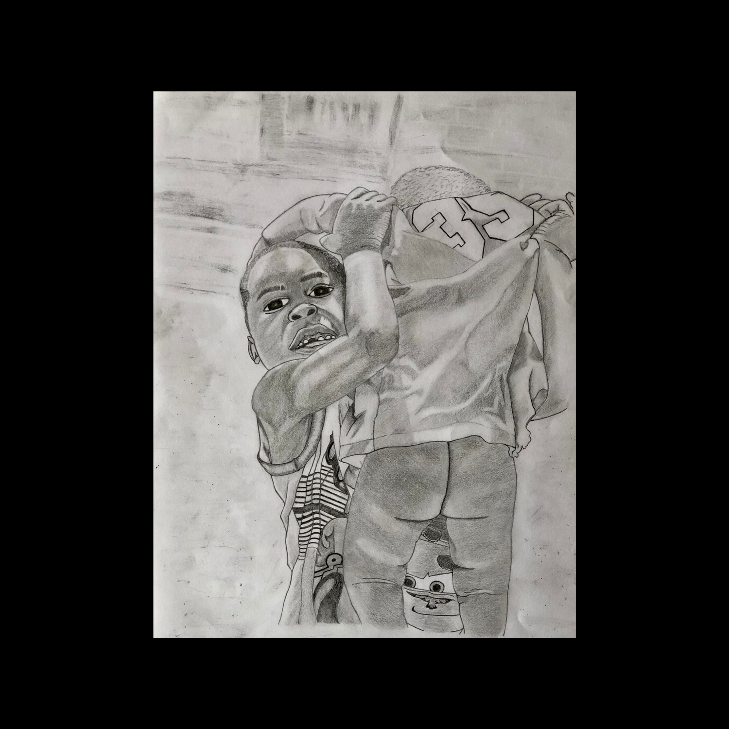 This artwork finds its roots in the stark disparities between worlds, portraying the harsh reality of a 'third-world' country where the weighty responsibilities typically shouldered by adults are unjustly thrust upon toddlers. In this poignant depiction, there is neither the luxury of time nor the opportunity to experience the carefree childhood that the children of so-called 'first-world' countries enjoy. Instead, a young guardian emerges, symbolizing the premature burden borne by the innocent.